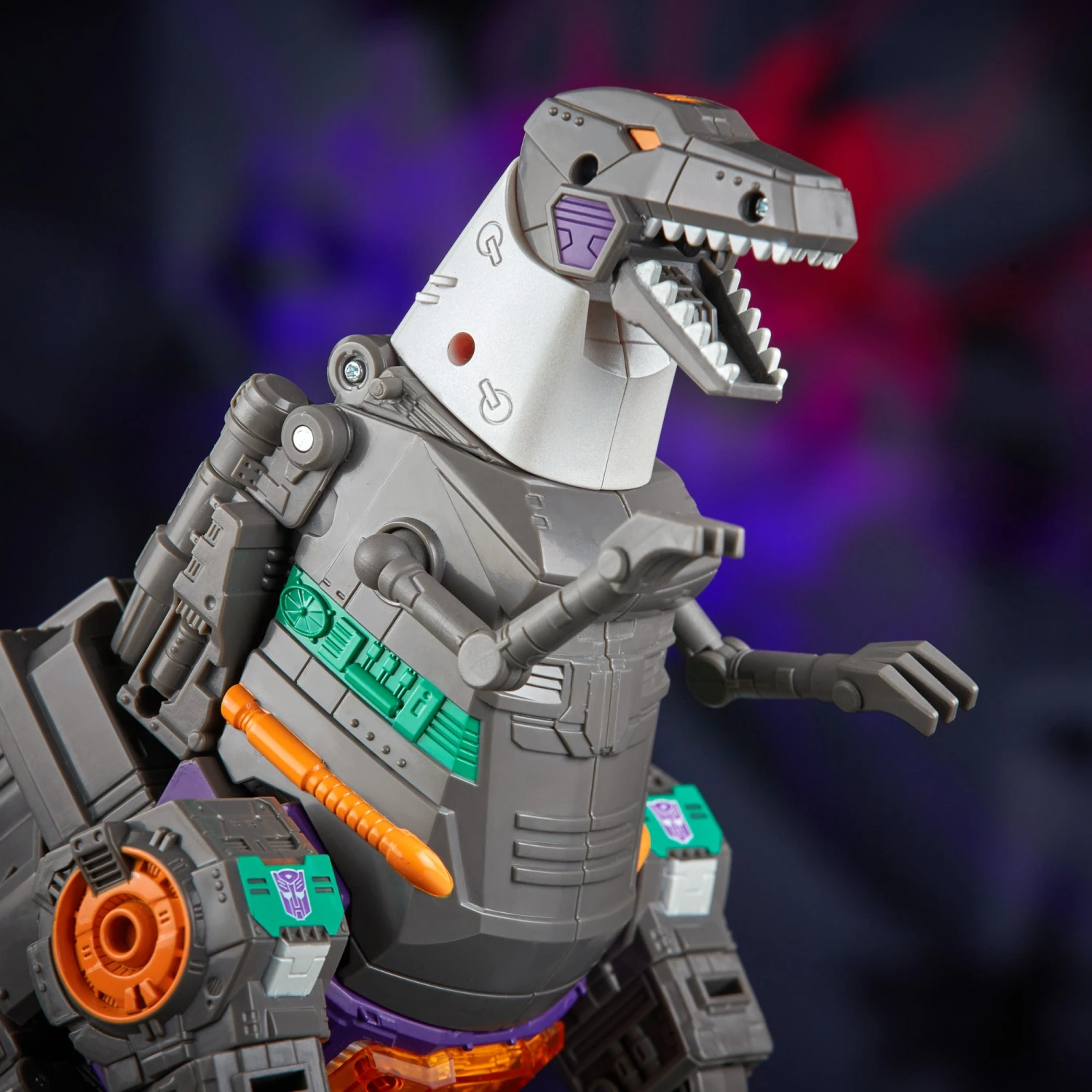 - This Grimlock Transformers figure’s deco is inspired by the Shattered Glass universe, complete with a purple Autobot logo